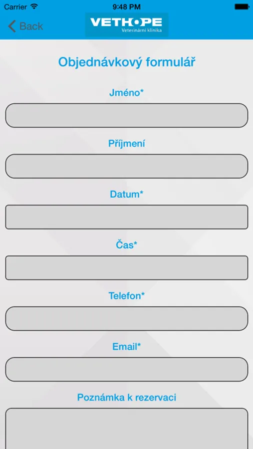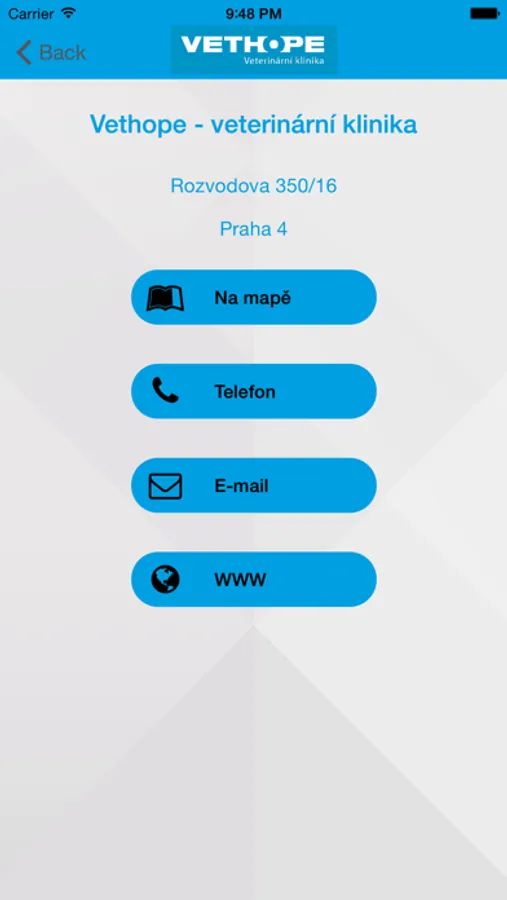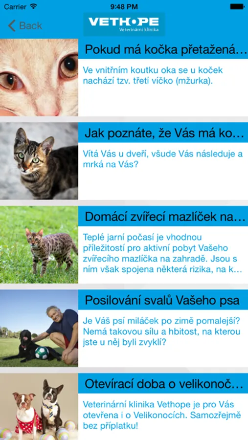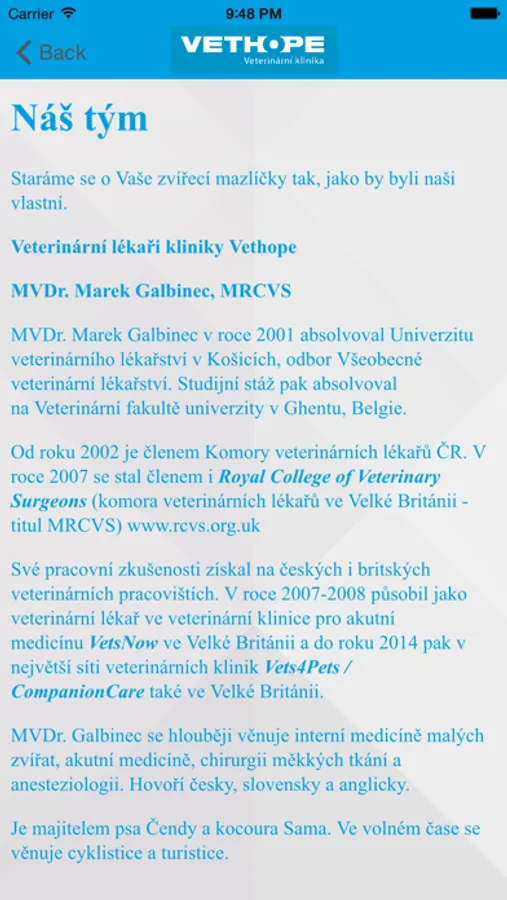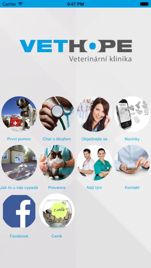 Vethope je veterinární klinika v Praze 4, která se zaměřuje na prevenci a léčbu malých domácích zvířat, především psů, koček a dalších drobných savců. Aplikace Vethope Vám vždy připomene, kdy svého zvířecího mazlíčka máte objednat na preventivní prohlídku nebo vakcinaci. Dále Vám umožňuje živě si chatovat s našimi lékaři, objednat se na veterinární kliniku nebo nám ihned zaslat fotografii problému či zranění Vašeho zvířecího mazlíčka ke konzultaci.