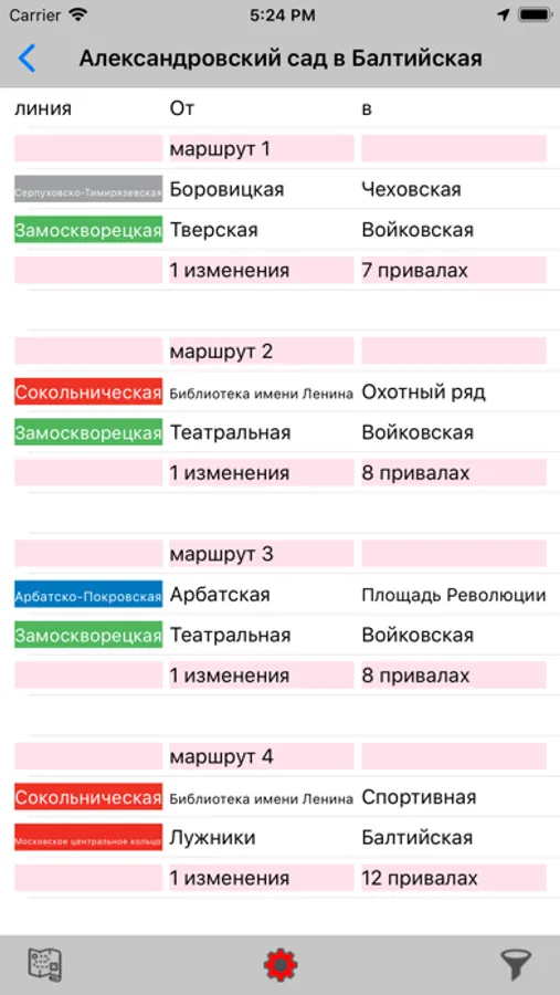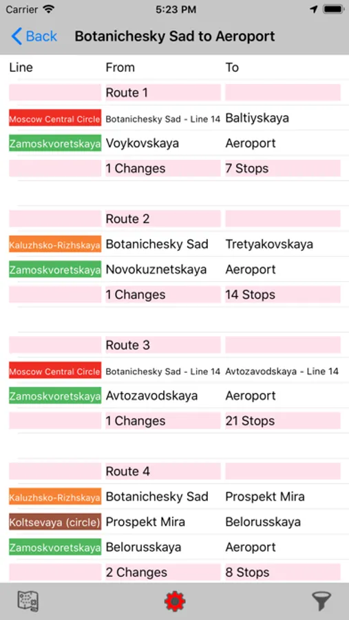 The search provides you with a list of alternative routes which can be used to travel from the source to destination station. It provides you with the number of line changes and station stops involved in each route.