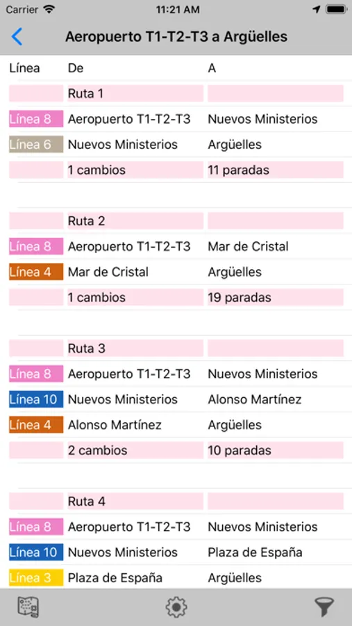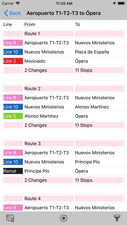 The search provides you with a list of alternative routes which can be used to travel from the source to destination station. It provides you with the number of line changes and station stops involved in each route.