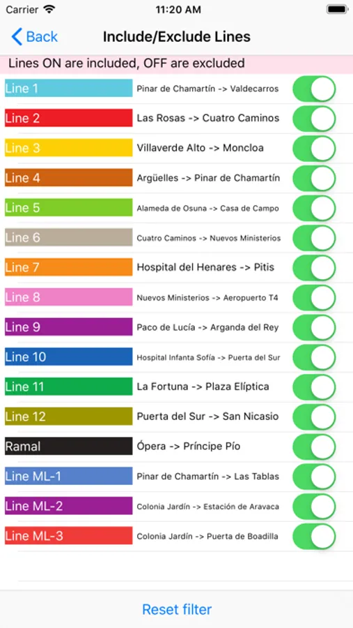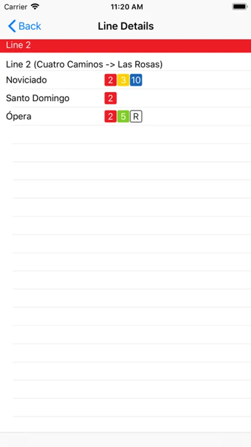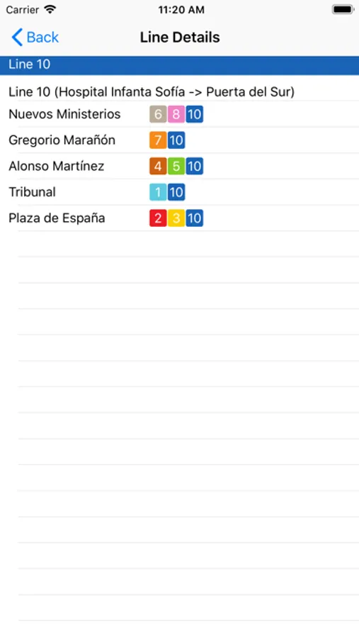 You can also view the detailed station list for each train line in Madrid. You can long tap on any station name from the list to see it on online maps.