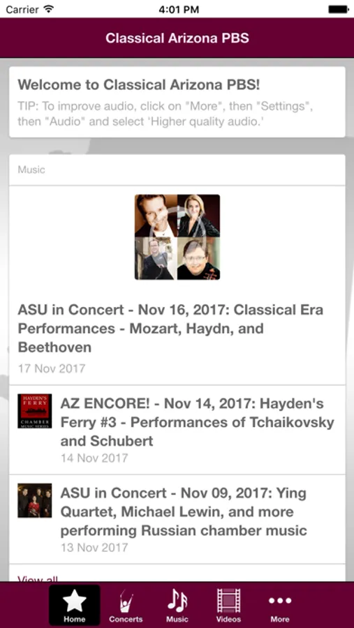 Listen to select live music recordings and productions produced by Classical Arizona PBS, including those featured on the radio programs ‘Arizona Encore’ and ‘ASU in Concert,’ as heard on 89.5 FM KBAQ and Classical Arizona PBS (DTV Channel 8.5). Plus, experience exclusive content including expanded interviews and music selections.