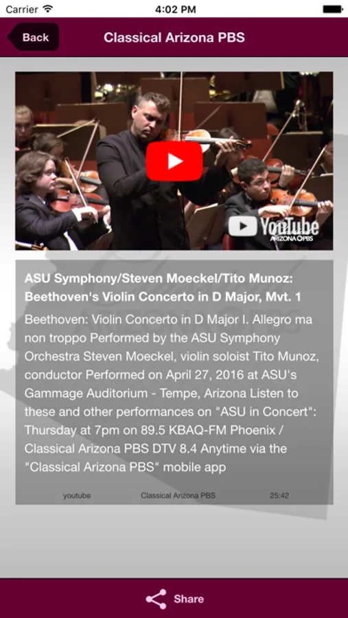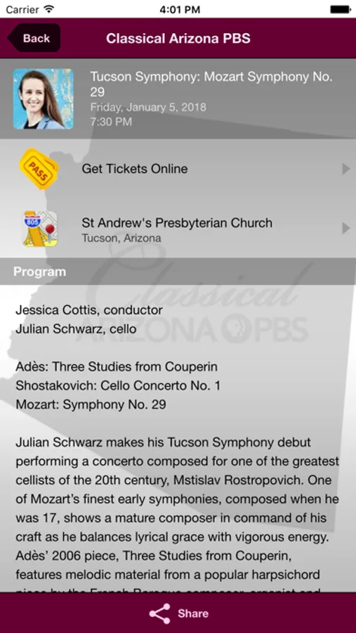 “Classical Arizona PBS” is a free mobile application to find out about classical concerts and events throughout Arizona, listen to high-quality broadcast productions, enjoy video excerpts from live performances, photos and more.