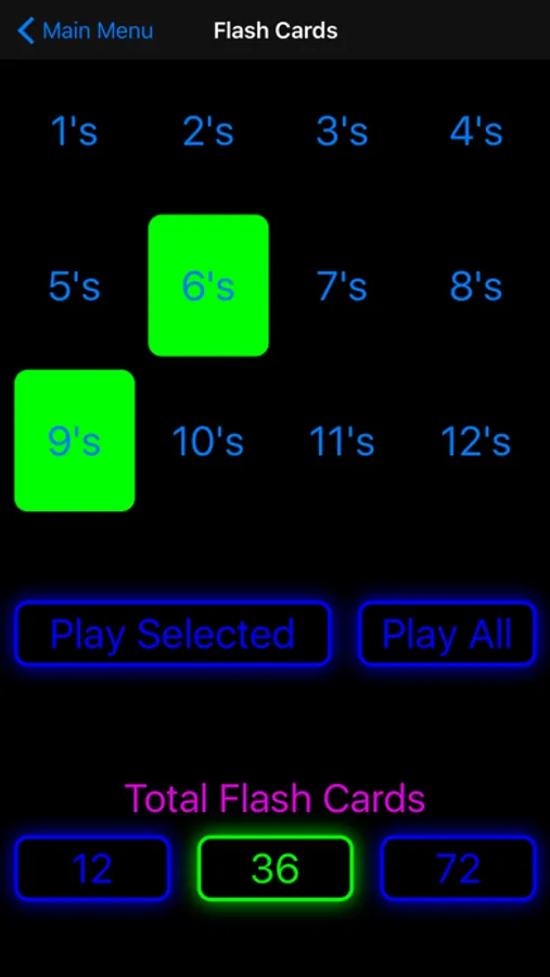 Choose one or more multiples to practice as flash cards with no time limit on each card. Choose how many flash cards you want to go through each test and get graded at the end.