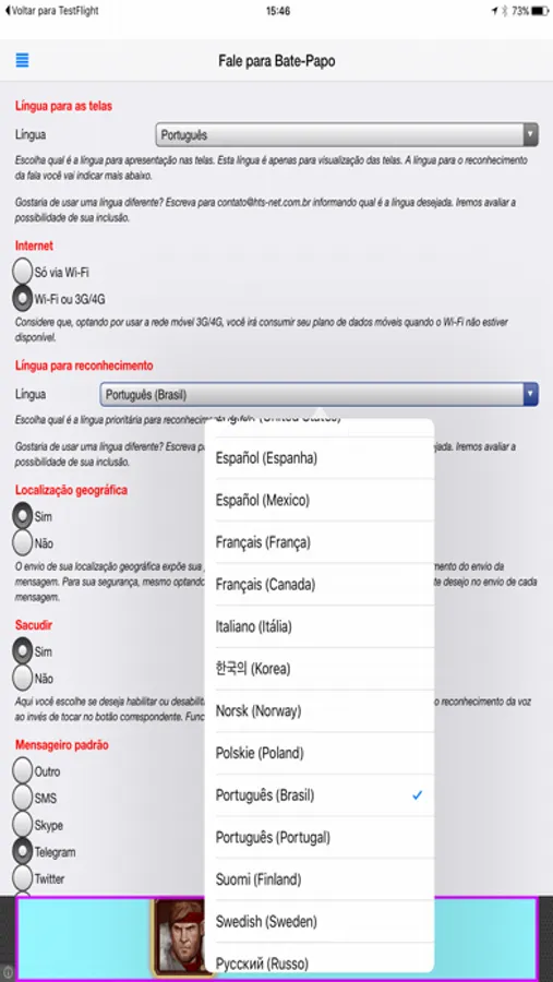 Allows you to set the language for the speech to be recognized (Portuguese, English, Spanish, Arabic, French and others), independently of the language of presentation of the screens.