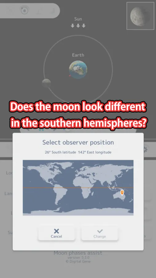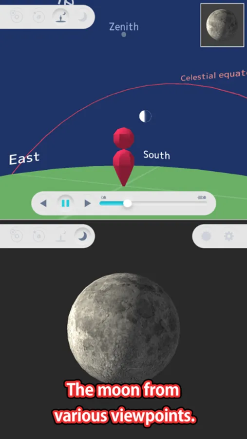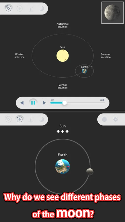 This app allows you to visually learn about the different phases of the moon depending on the positions of the moon, the Earth, and the Sun.