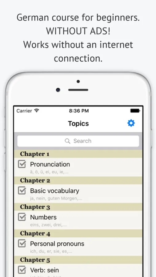 Thanks to thousands of exercises, almost 7000, you can learn the 500 words of basic vocabulary. The exercises stimulate you to read, listen and write many times each word. You will learn the numbers, the weekdays, the time, the conjugation of the verb "sein" (to be) and everything required to construct simple sentences helping you in your daily live.