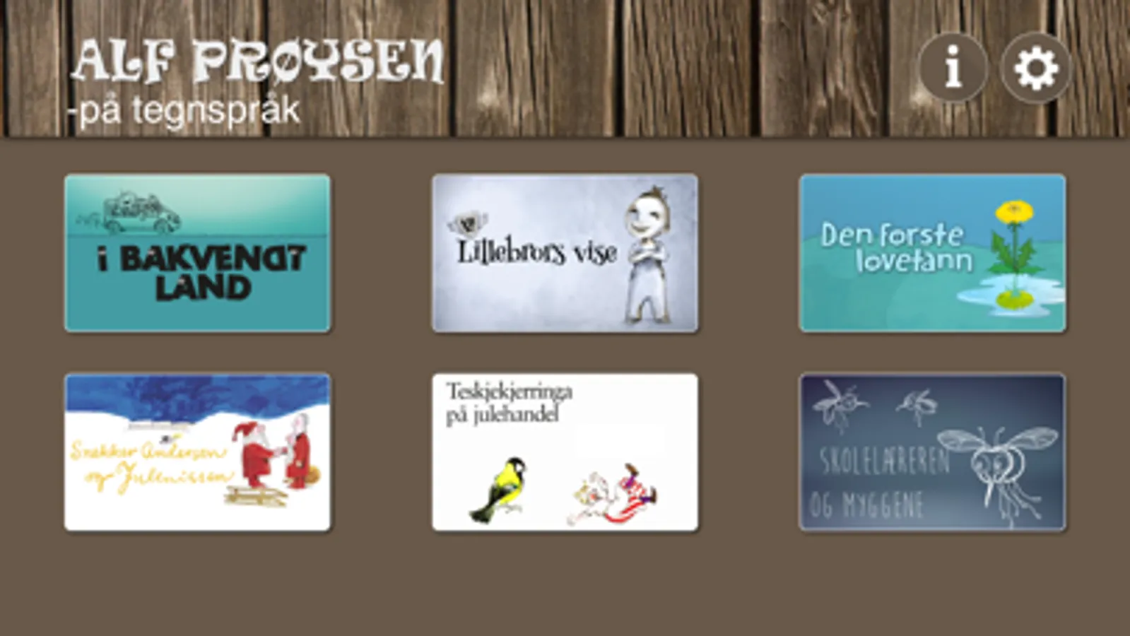 Med denne appen får du oppleve tre av Alf Prøysens barnesanger og tre av hans fortellinger på norsk tegnspråk.