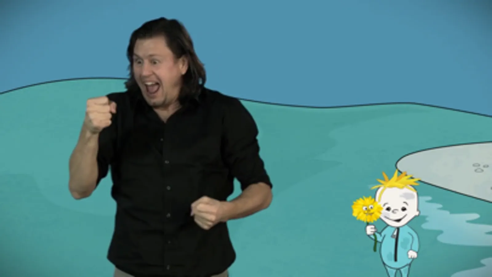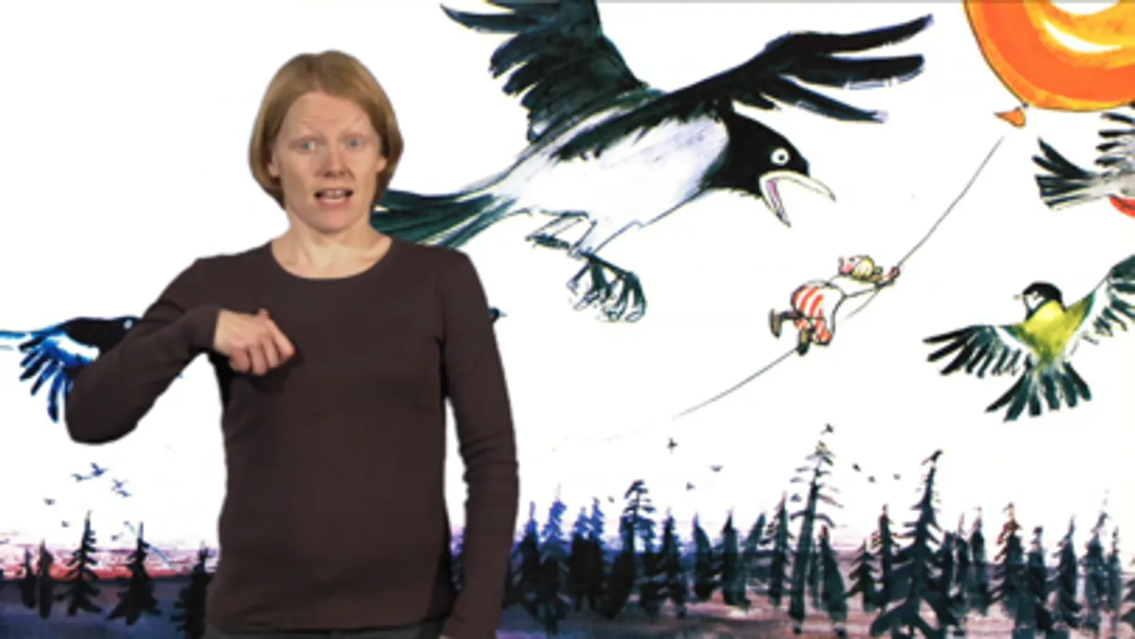 "Skolelæreren og myggene" fremføres på tegnspråk av Gøril Grindhaug, med Kjersti Fjeldstad som stemmeskuespiller.
