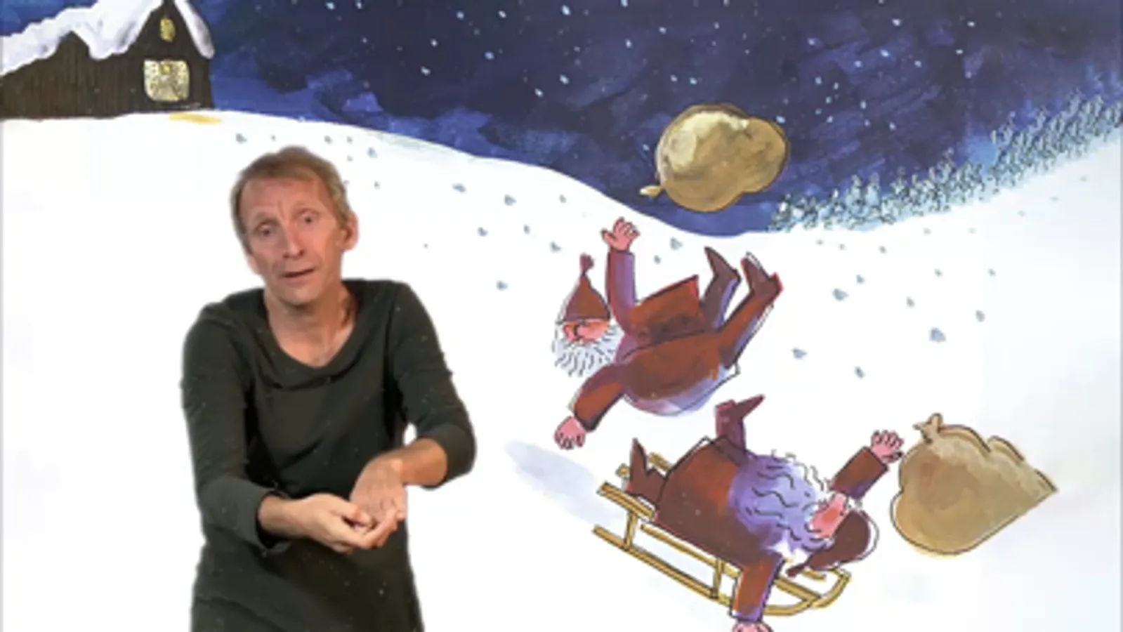 "Teskjekjerringa på julehandel" fremføres på tegnspråk av Unni Helland, med norsk tale av Hege Bakken.