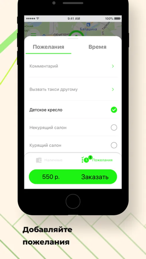Добавьте к заказу дополнительные пожелания. Например, когда на улице +35 — выберите "кондиционер". Если вы не переносите запах табака — укажите "Некурящий салон", и к вам приедет некурящий водитель.