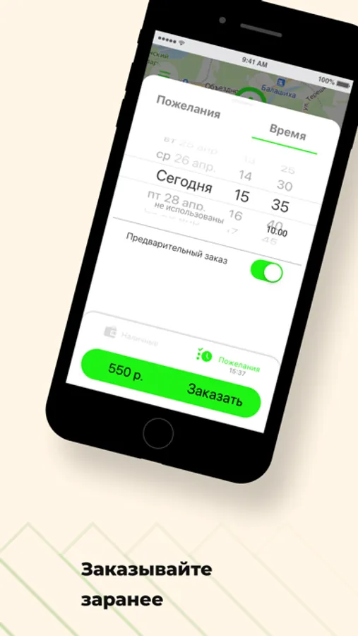 Выберите опцию “Предварительный заказ”. Поиск автомобиля начнется незадолго до заказа поездки, и автомобиль приедет к назначенному времени. Также вы будете заранее знать стоимость поездки.