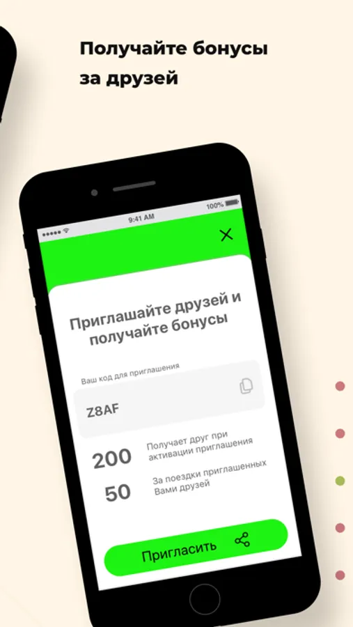 Приглашайте друзей в приложение и зарабатывайте бонусы с помощью реферальной системы. Оплачивайте ими и экономьте на поездках.