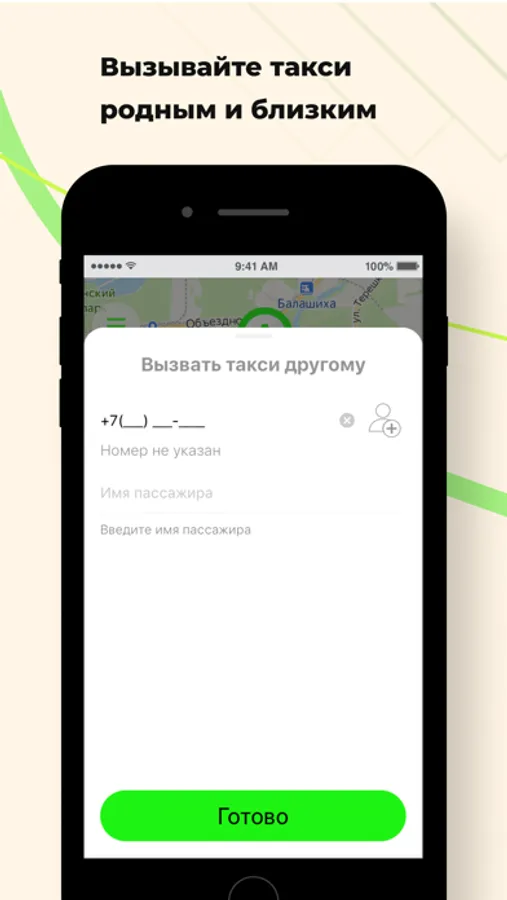 Используйте опцию “Вызвать такси другому” в разделе “Пожелания” и укажите его номер телефона. Когда такси подъедет, на указанный номер придет СМС, а вам — сообщение в приложении.