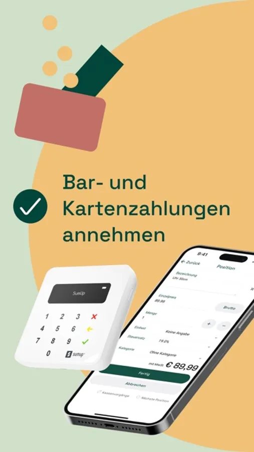 - Bar- oder Kartenzahlungen annehmen (Kartenzahlungen können z.B. über ein SumUp Terminal abgewickelt werden).
