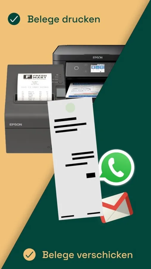 - Rechtskonforme Belege erstellen (Ausdrucken über A4- oder Bondrucker; weiterleiten per E-Mail, WhatsApp oder andere Dienste).