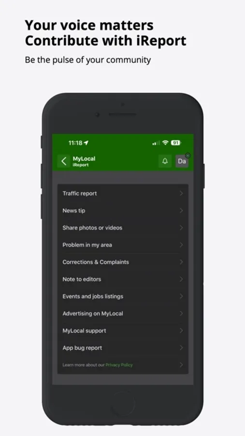 iReport: Contribute to MyLocal by sharing news, traffic updates, and your photos and videos.