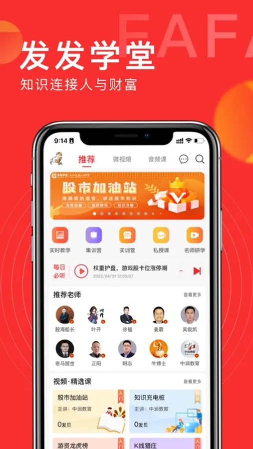 发发学堂APP,是中润教育旗下专业的投资者教育服务平台。中润教育以普及金融知识提供金融教育为己任,致力于成为财商教育领域领先的互联网在线服务商。通过知名教授、专家、基金经理以及草根派实战大咖围绕金融理论与实践讲学,并联合国内优质音像出版社、视频在线平台、知识共享平台以及行业内知名线下培训机构,持续以视频和音频的形式传播金融知识。发发学堂,课程内容涵盖了炒股的多种知识点, 帮大家解读股市中的各种问题,让股民每天都能学习一个股票知识点。推出了 《名师研学》、 《操盘笔记》、 《每日必听》等公益投教视频和文字课程, 增强投资者风险教育,倡导安全投资,推动投资者教育事业更好发展。