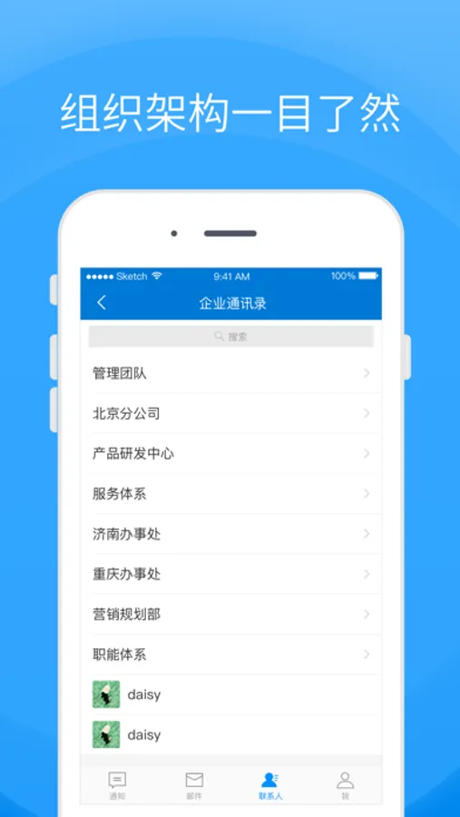 提供树状架构显示方式,组织架构层级清晰;支持个人联系人与邮件联系人,自由管理人脉资源;