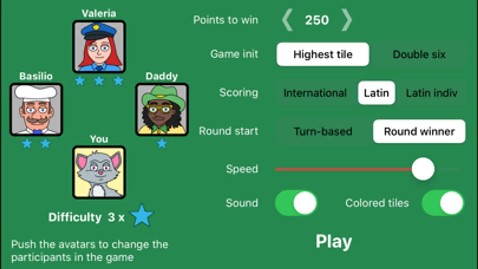 A bot can play dominoes in a basic way (1-star), average (2-stars) or good (3-stars). Depending on the bots you choose, the game difficulty can range between 2 and 8 stars. Take into account that the bots will take more time to play if they have more than a tile to play, otherwise they will react faster.