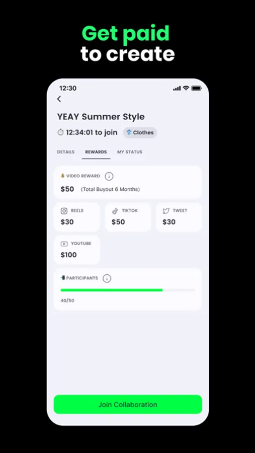 On YEAY, we'll show you available collaborations, their requirements and rewards. You decide if you want to join - it's that simple! Creating an account and connecting your socials is a breeze, and once you've found a collaboration you're interested in, all you have to do is create your video and submit it along with your social media post link to earn rewards.