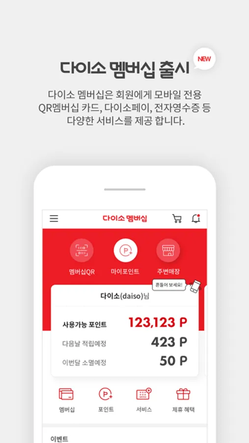 휴대폰을 흔들어 멤버십 포인트 적립과 사용을 쉽고 빠르게 이용하실 수 있습니다.