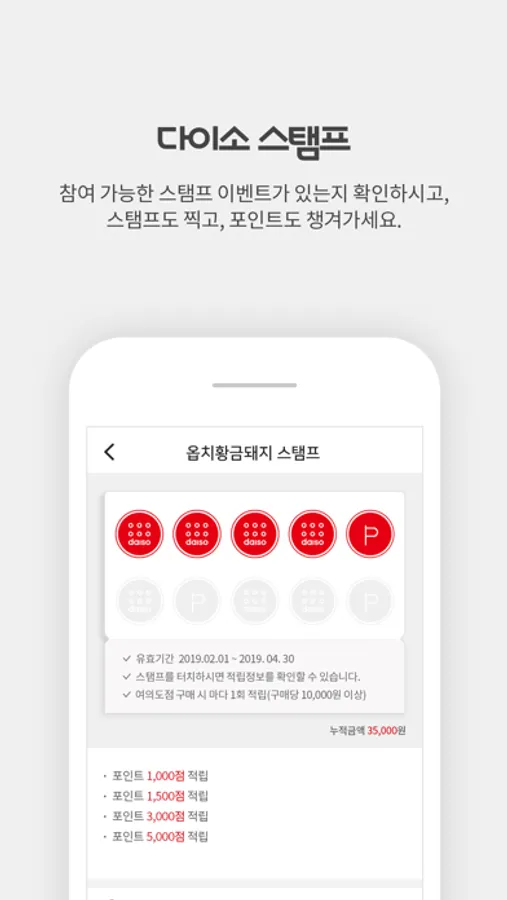 - 다이소 상품 구매액의 0.1%를 적립하실 수 있으며, 50포인트 단위로 현금처럼 사용 가능합니다.
