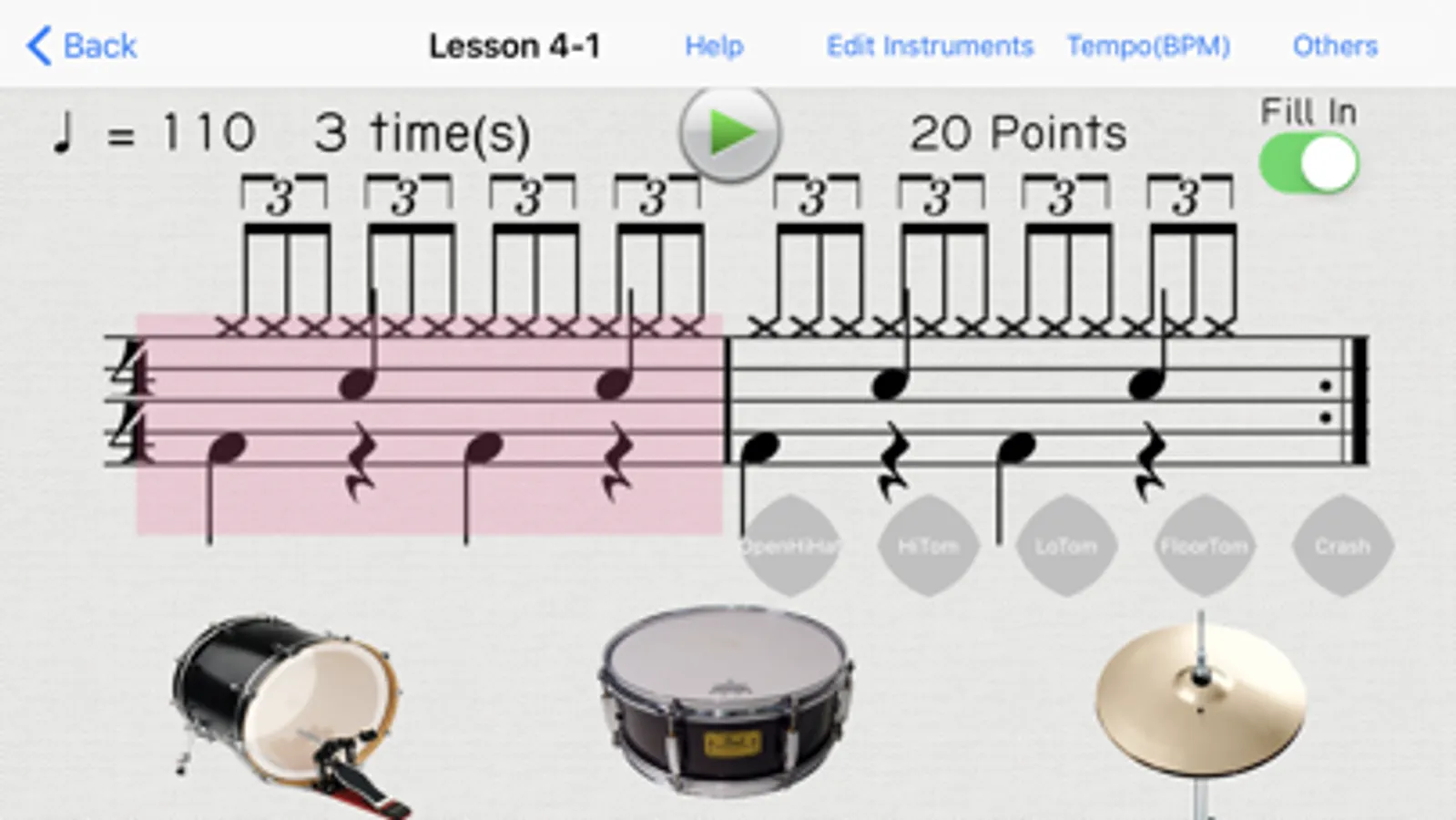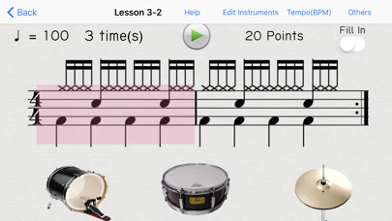 Using this application, you can easily learn to read notations of Bass Drum, Snare Drum, and Hi-hat.