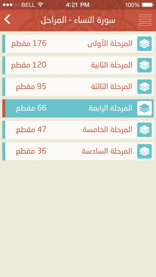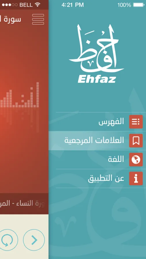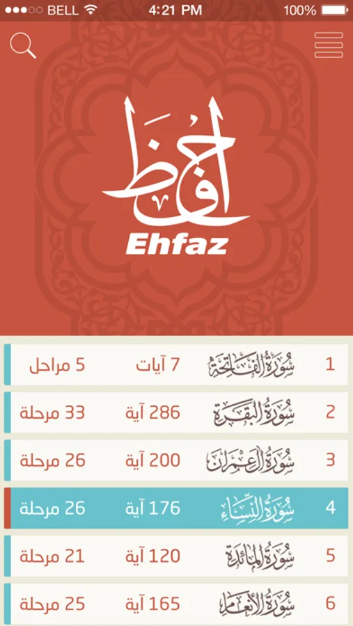 EHFAZ app is designed to facilitate memorization of the Holy Quran Surahs “chapters” using theLouh “tablet” method. Each Quran Surah “chapter” of more than 6 Ayahs “verses” is divided into several 6-ayah tablets. Each Louh “tablet”is memorized in 4 phases. Each phase is composed of some sound clipsarranged in a hierarchy to facilitatelistening and repeating untilmemorization by the young, old, and non-Arab.