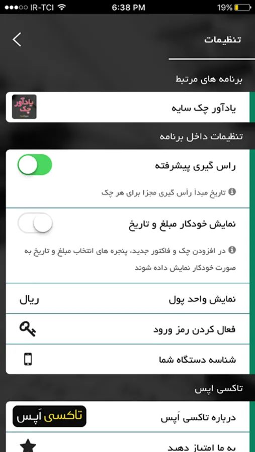 این اپلیکیشن که هم اکنون هزاران نفر از اهالی کسب و کار را همراهی می کند، قابلیت های ساده ولی پر کاربردی را دارد. راس گیری و محاسبه بهره چک ها ، محاسبه راس فاکتور ها (مناسب برای ویزیتور ها و مسئول امور مالی) و محاسبه وام های بانکی.