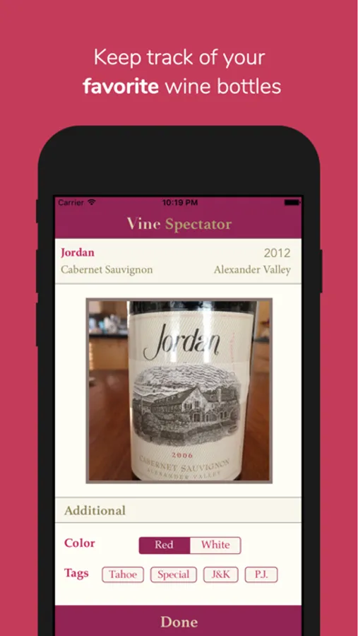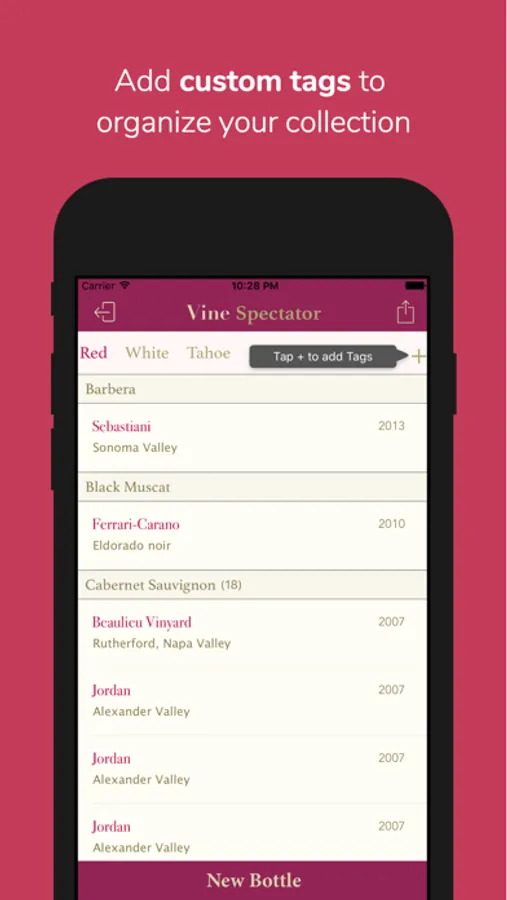 Wine bottles can be sorted by year, grape variety, or color with the tap of a button. Use custom tags to further organize your collection. There's even a place to revisit the bottles you've already enjoyed, just tap on the wine glass!