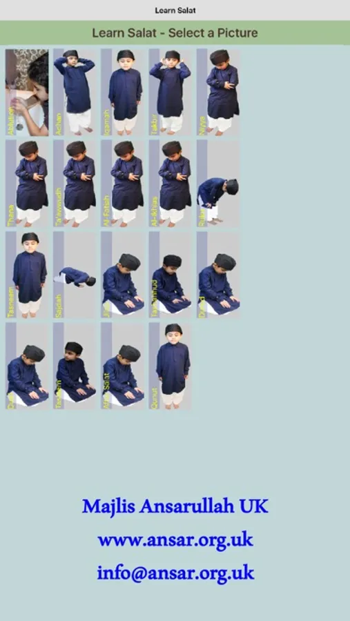 Learn Salat is an interactive app which will help children or new comers to Islam to learn and memorise the Arabic wordings of the Salat. Learn the meaning of the Arabic text of the Salat
