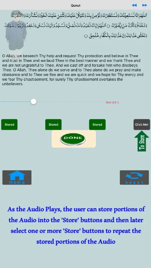 This Salat App helps the user to memorise the Arabic text by listening to the audio. While the audio is playing the user is presented with 4 memory buttons into which can be stored a portion of the audio that would be comfortable with to memorise.