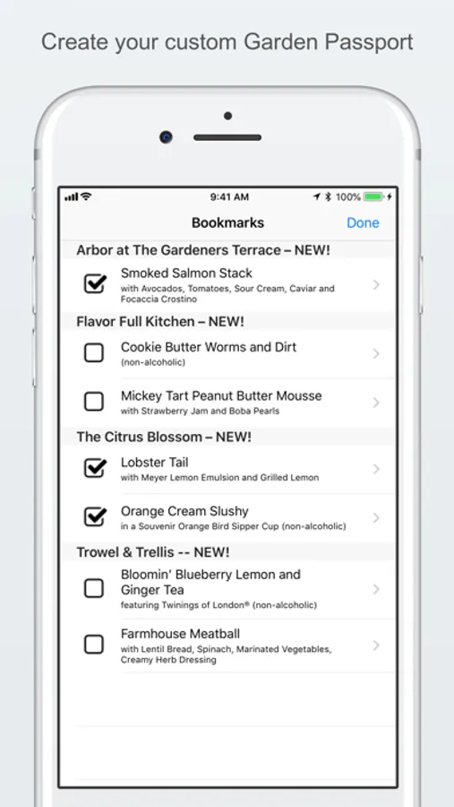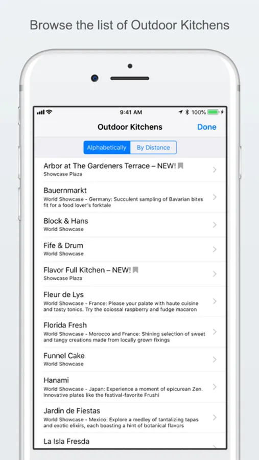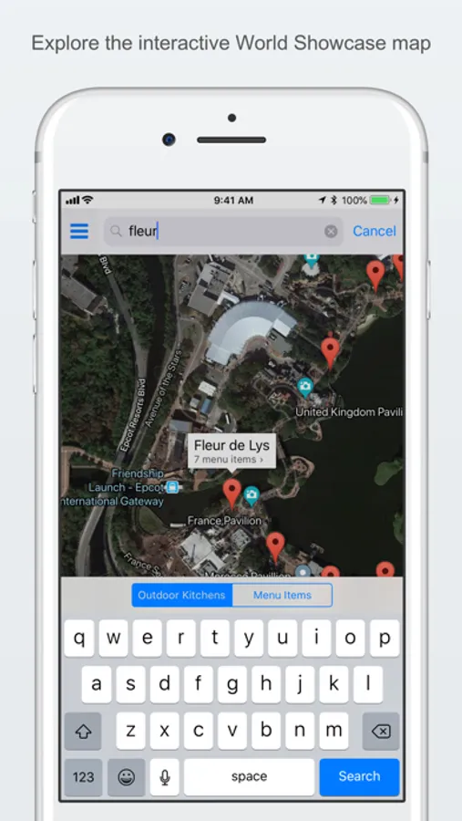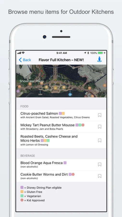- While inside Epcot®, use your iPhone's GPS location to browse the list of Outdoor Kitchens that are nearby