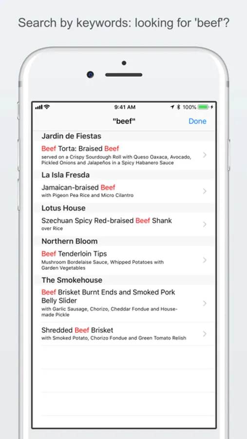 - Search the list of menu items by keywords. Looking for a dish containing "beef"? Or a good "chardonnay"?
