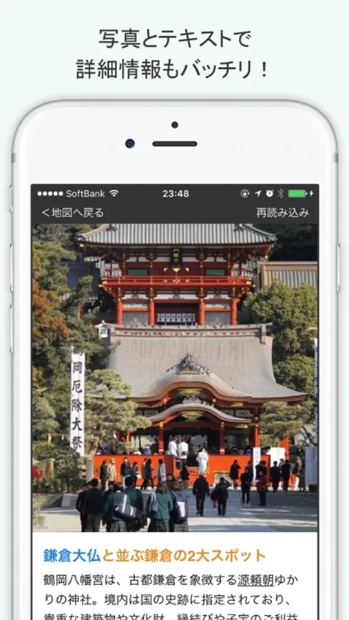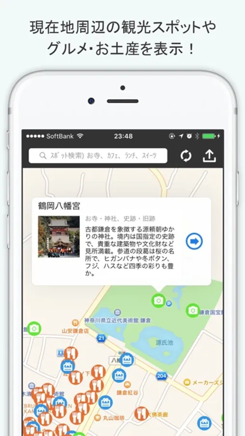 現在地周辺の観光スポット、グルメ、お土産などを地図に表示する鎌倉観光用の無料ガイドアプリです。