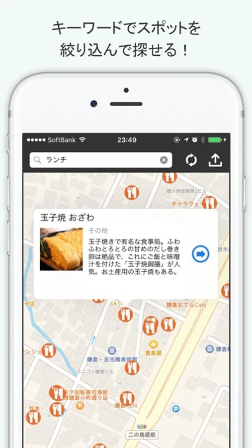 アプリを立ち上げると、現在地の地図が表示されて周囲にあるスポットのアイコンが表示されます。アイコンをタップするとそのスポットの基本情報が、さらにタップすると詳細情報が表示されます。