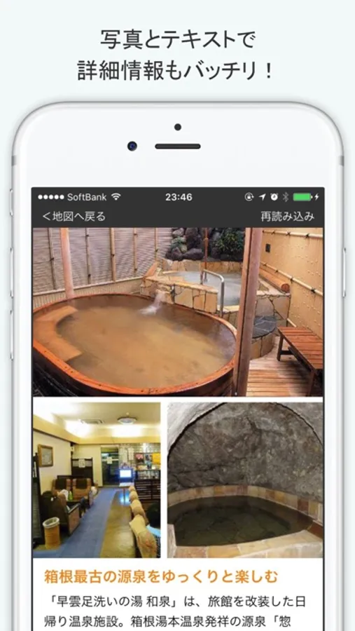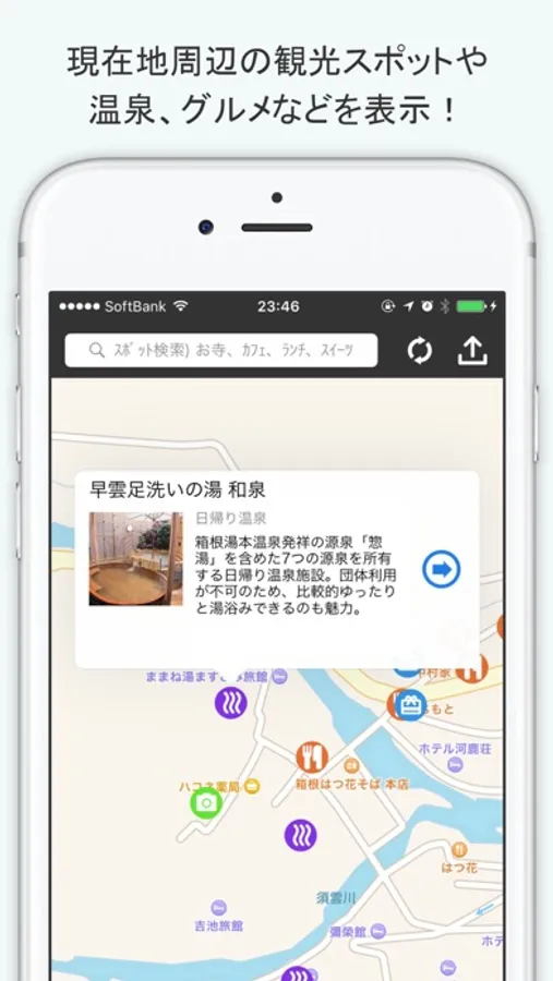 現在地周辺の観光スポットや温泉、グルメ、お土産などを地図に表示する箱根観光用の無料ガイドアプリです。