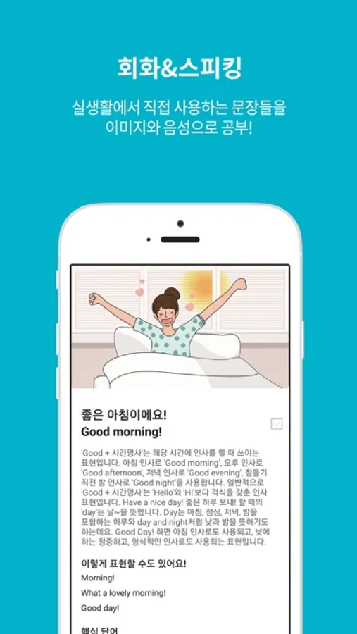 - 회화를 다양한 방법으로 공부하고, 연습해 볼 수 있어요. 하루하루 달라지는 회화 실력을 느껴보세요!