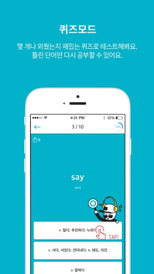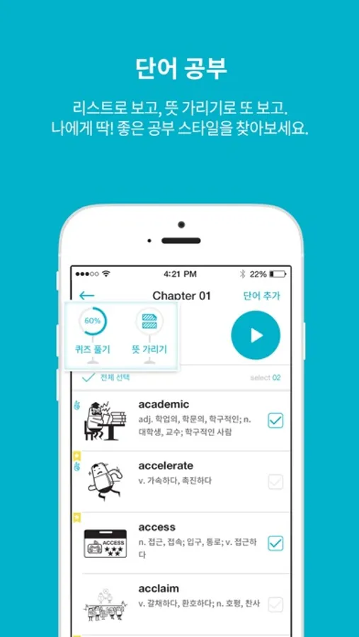 - 재미있게 퀴즈를 풀면서 단어를 암기하니까! 단어 암기가 지루하지 않아요.
