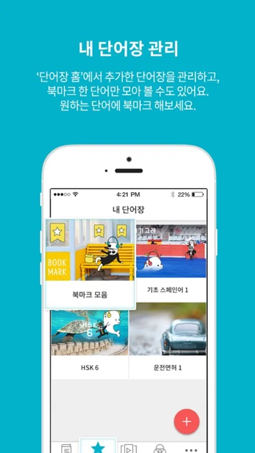 - 원하는 단어장은 북마크 해서 언제든지 볼 수 있고, 나만의 단어장을 직접 만들 수도 있어요.