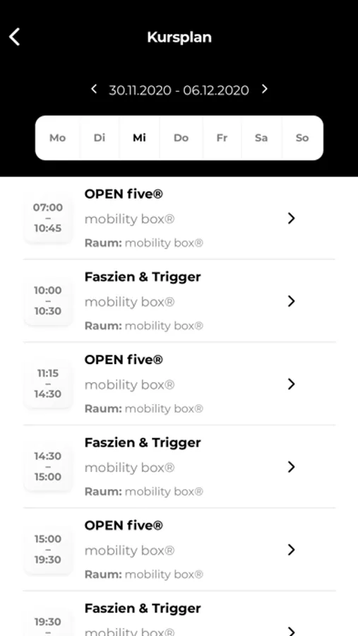 Den aktuellen Kursplan kannst du jederzeit über die App abrufen, somit bist du immer informiert, wann die Kurs beginnen. Du wirst nie wieder deinen Lieblingskurs verpassen.