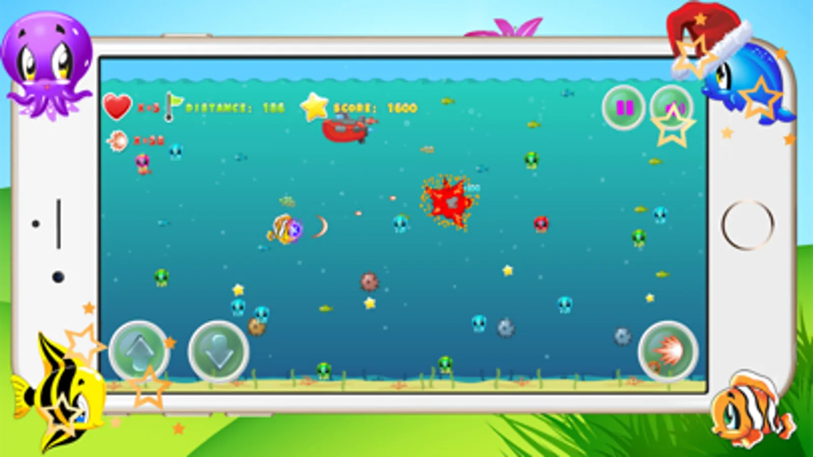 Use the on screen side touches to move the fish up and down, and the right side to beam power. passing through the waypoint to collect powerups and bonus to boost scores. Don’t try to touch the submarine or other obstacle, to record the longest distances, or your cute fish gets wasted.
