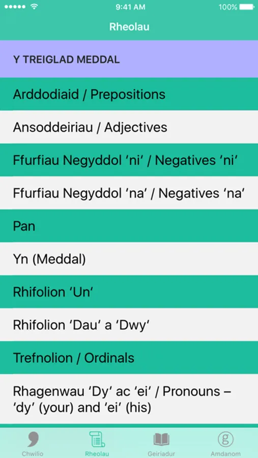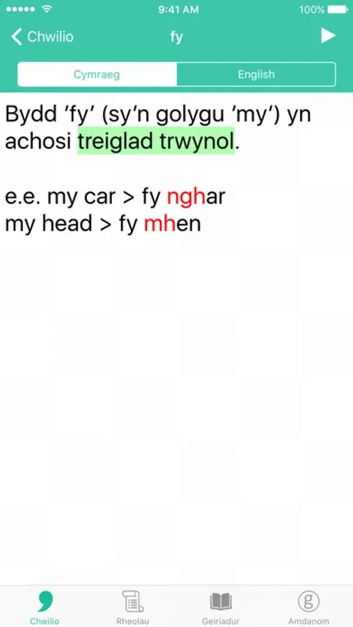 The aim of this app is to help Welsh speakers and learners to check mutations. The search element of the app only includes those words that will cause the immediate word that follows to mutate. Therefore, this element does not include every rule with regards to mutations. However, the revision element of the app is more comprehensive, and it is aimed as a tool to aid revision of the mutation rules.