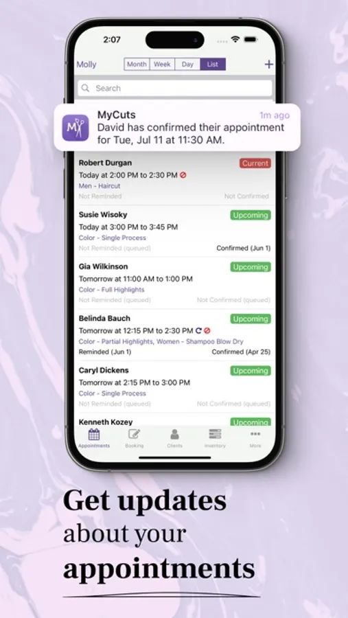 Need a calendar you can count on? MyCuts gives you peace of mind with quick appointment booking and effortless tracking of upcoming clients. Whether you prefer a monthly, weekly, daily, or list view, our intuitive booking app enables you to organize and access vital information on the fly. Or dive into the details and search specific appointments by client name, email, or phone. With color-coded options and timely push notifications, you'll always be one step ahead of your day-to-day appointment schedule.
