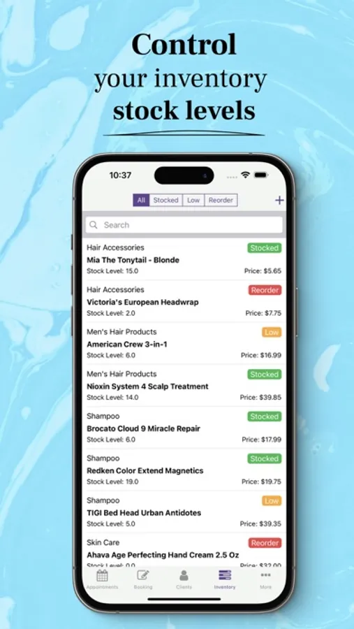 Manage your inventory in the palm of your hand with inventory tracking. When you're finished appointment booking, view your stock levels and detailed insights on your inventory to start making data-driven decisions. Mark items to reorder, run reports by date, receive push notifications, and more to avoid surprises and ensure smooth business operations.