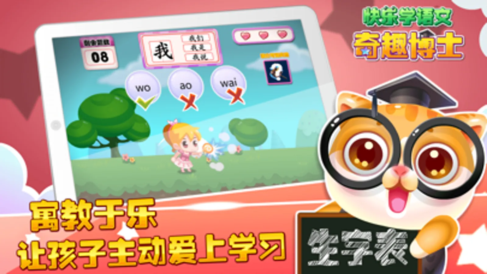 对于孩子来说学习的最大难点是无法集中注意力和缺乏自信心而失去兴趣,奇趣博士把汉字拼音学习巧妙的融入游戏,让孩子更专注与学习,并在挑战关卡中获得快乐与自信,让孩子更健康快乐的成长~