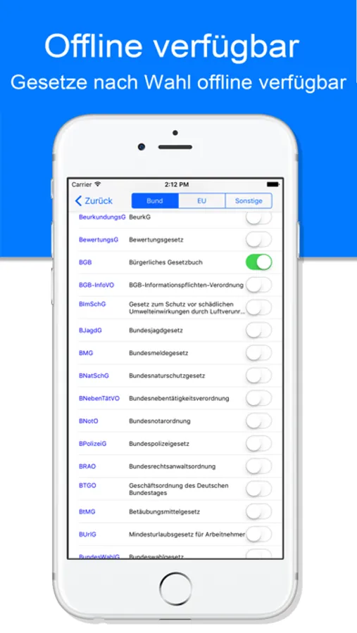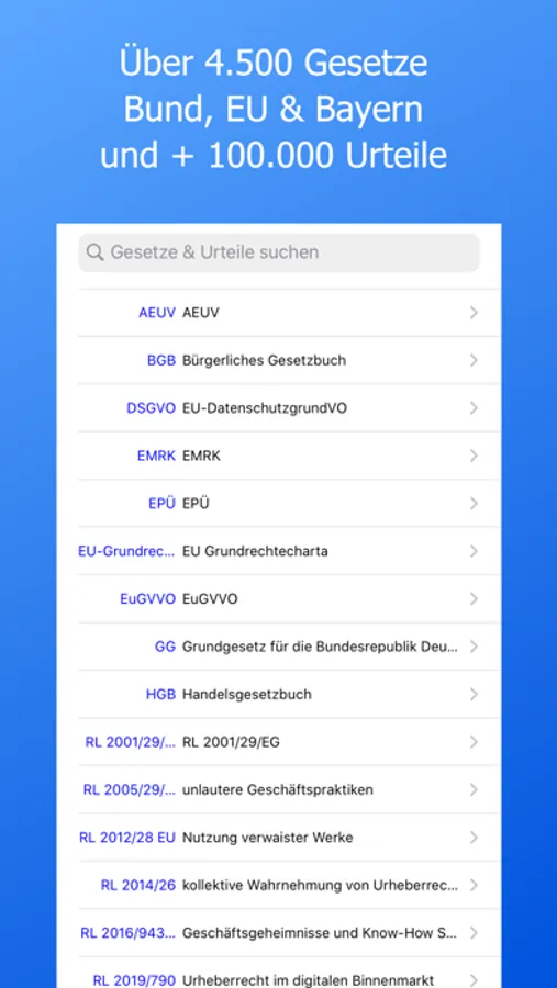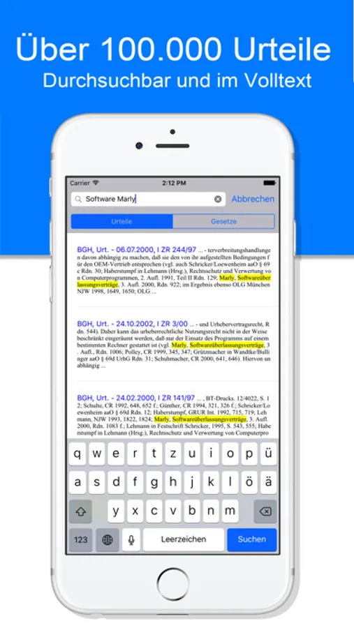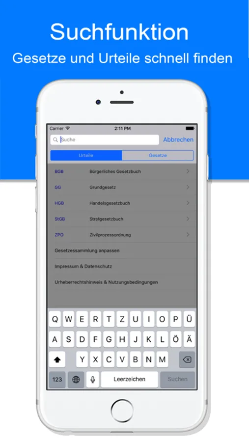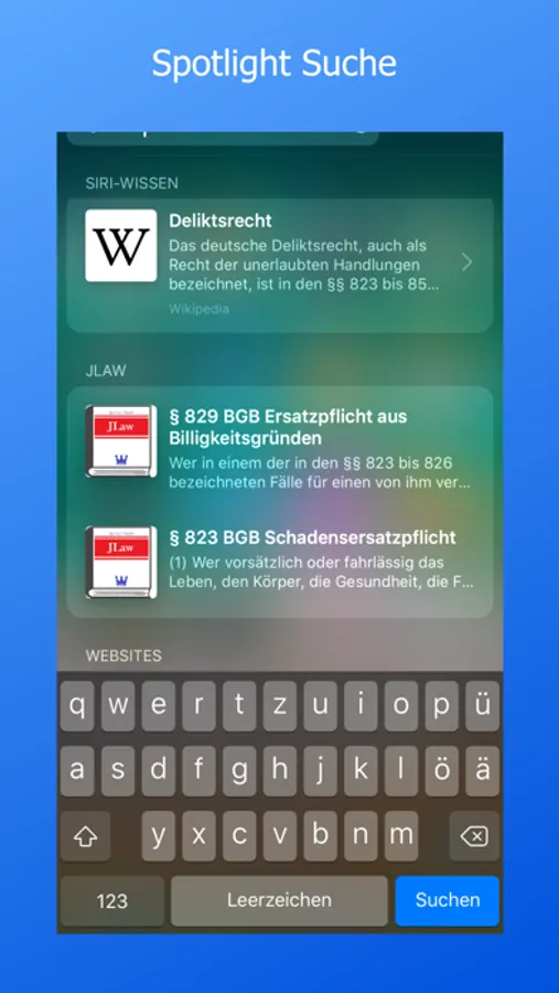 Eine Volltextsuche der genutzten Gesetze ist auch über die Spotlight-Suche in iOS auffindbar.