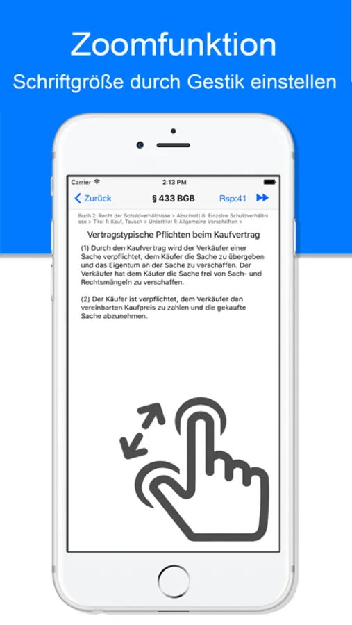 - Mit "Wisch"-Gesten ist das "Blättern" innerhalb des Gesetzes möglich.