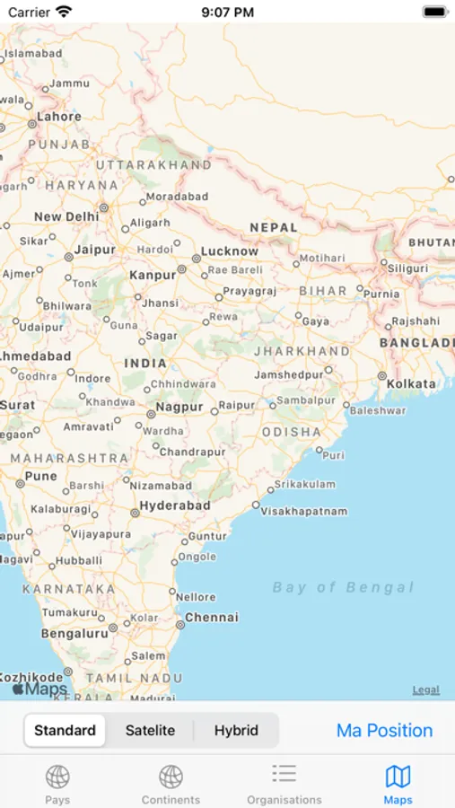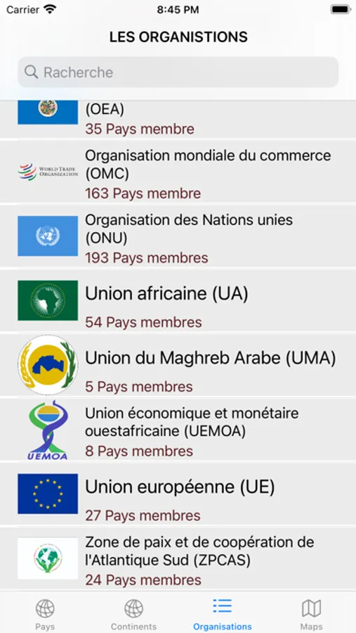 Vous avez les pays en général, les continents, les organisations et un Maps.