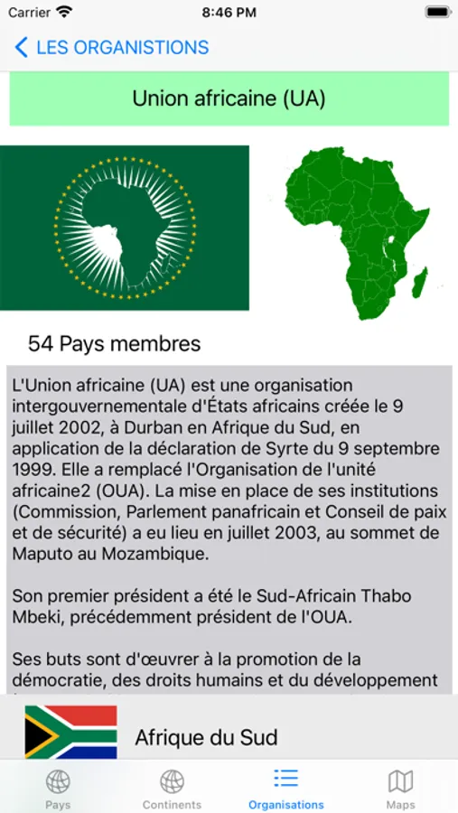 La partie de continents vous donne des informations sur le continent et les pays membres